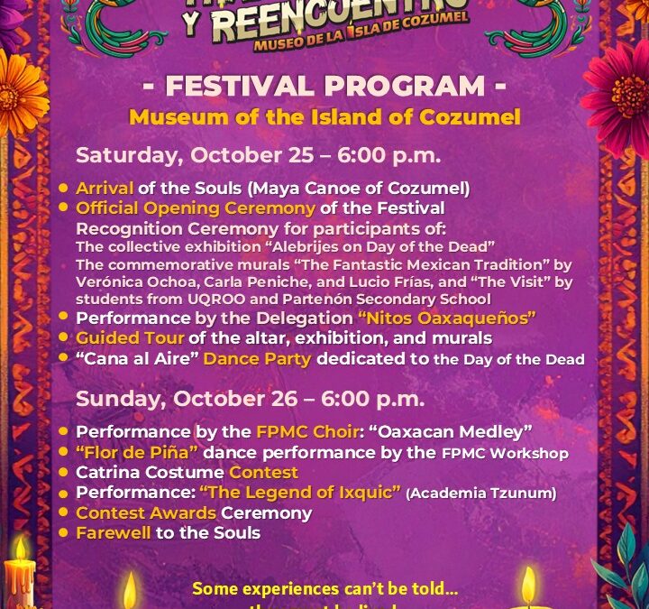 Experience the magic of the Day of the Dead in an atmosphere filled with color, art, and emotion. This October 25 and 26, the Museum of the Island of Cozumel will transform into a meeting place between life and memory with the “Tradition, Light & Reunion” Festival.
