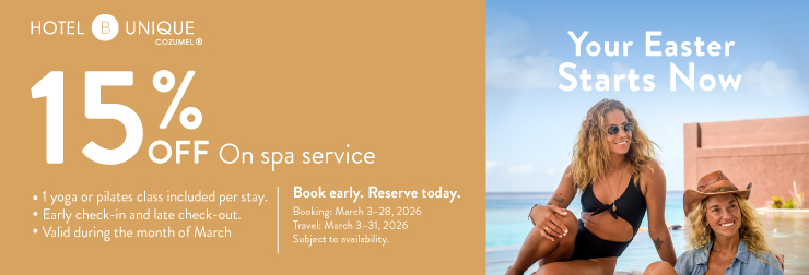 Your Easter Escape Starts Now Plan ahead and treat yourself to a unique escape at Hotel B Unique Cozumel. Enjoy art, Caribbean calm, and wellness moments before the busy holiday season begins. Includes: β’ 15% OFF Spa services β’ One yoga or pilates class included per stay β’ Early check-in and late check-out (subject to availability) BW: March 3 β 28, 2026 TW: March 3 β 31, 2026 Plan ahead. Book today and experience a unique escape by the sea.