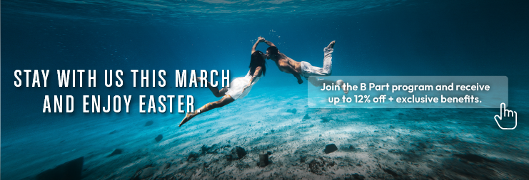 Plan ahead for Easter and escape to Hotel B Cozumel. Stay during March and get up to 12% OFF your reservation when you subscribe to BPart, while enjoying the calm Caribbean atmosphere and relaxing wellness experiences by the sea.